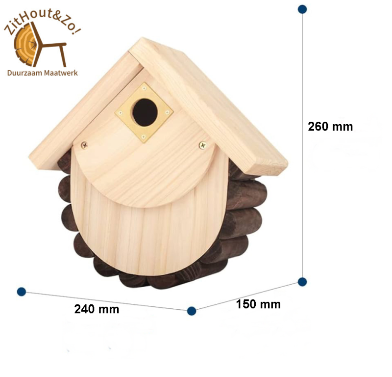 Per vogelsoort is de ronde ingang anders. Graag aangeven voor welke vogel u het huisje wilt inzetten. Dan passen we de ingang (doorsnede) daarop aan. LET OP: 1 optie aangeven!
