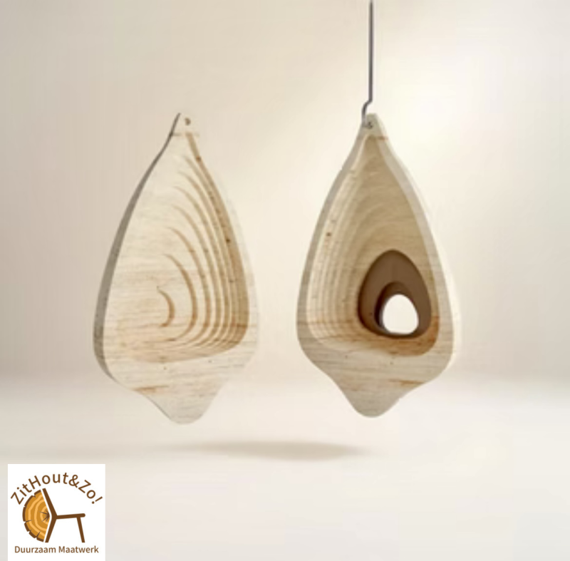 Vogelhuisje: Modern vogelhuisje met een druppelvormige organische vormgeving. Vrij hangend met een bijgeleverde staaldraad aan een boom of ander bevestigingspunt wat aanwezig is in uw tuin.